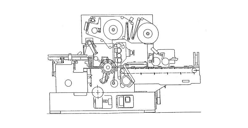 (二)機(jī)械傳動(dòng) 401型小包薄膜包裝機(jī)由立勵(lì)磁的直流分路繞線式電機(jī)提供驅(qū)動(dòng)力。主電機(jī) (2)通過定時(shí)皮帶 (3)帶動(dòng)主傳動(dòng)軸 (1),主傳動(dòng)軸 (1)將動(dòng)力分配成5路。 主傳動(dòng)軸上的齒輪系 (10)傳動(dòng)軸 (15),軸 (15)通過傘齒輪體 (12)帶動(dòng)定時(shí)皮帶 (11)。定時(shí)皮帶 (11)驅(qū)動(dòng)分離輪 (13)和傳送輪 (14)2路 ,主傳動(dòng)軸上的錐齒輪副 (8)帶動(dòng)偏心圓盤 (16)和連桿 (17),拖動(dòng)行走架 (18)和輸人推送器 (19)作往復(fù)直線運(yùn)動(dòng)。